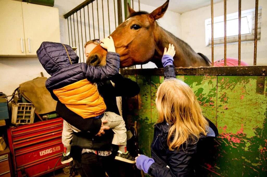 Bringt gerne Karotten oder Äpfel mit – unsere freundlichen Trabrennpferde freuen sich riesig über die Leckerlis! Ihr dürft die Pferde nicht nur streicheln, sondern sie auch selbst füttern – ein echtes Herzenserlebnis – und für viele Kinder der schönste Moment des Tages.